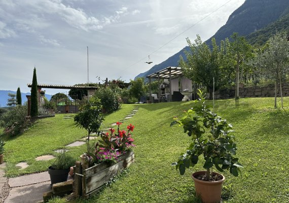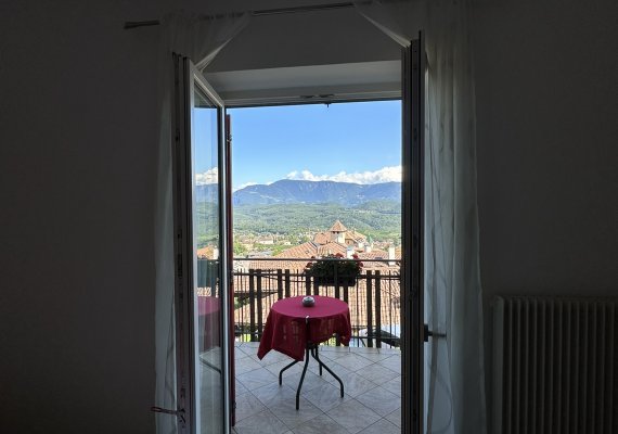 Sitzbereich vor der Haustür und Balkon an der Ostseite mit Blick auf das Tal